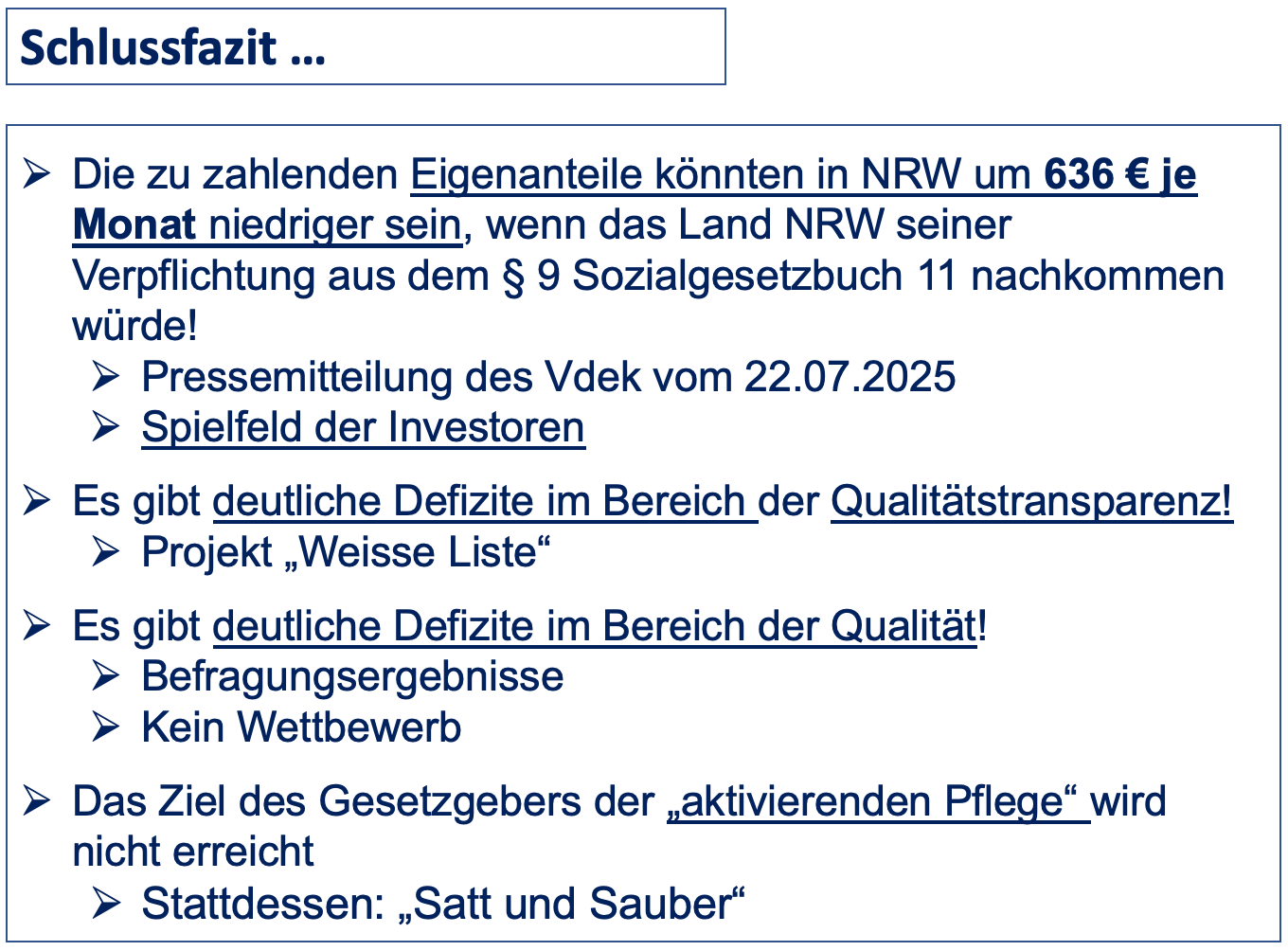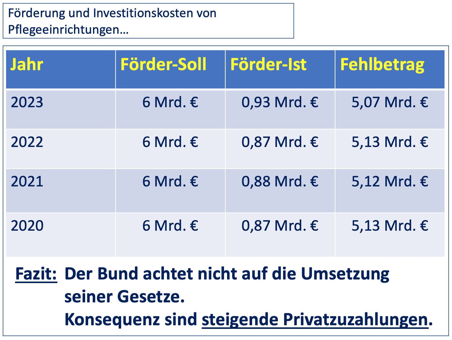 Wenn dieser Betrag den Pflegeheimen, wie es im Gesetz steht, von den Ländern zur Verfügung gestellt worden wäre, wären die von den Bewohnern zu leistenden Eigenanteile um mindestens 600 Euro im Monat niedriger.