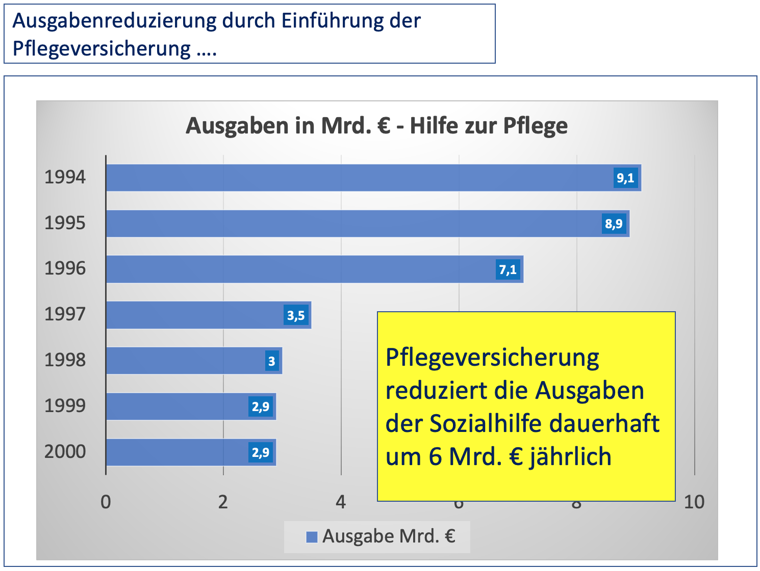 Zu den Investitionskosten wird in diesem Bericht noch einmal darauf hingewiesen, dass bei Einführung der Pflegeversicherung im Jahr 1995 der politische Kompromiss war, dass die Länder die Einsparungen im Bereich der Sozialhilfe für Investitionskosten der Heime zur Verfügung stellen sollten.